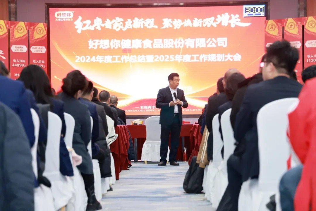 2025年2月6日,好想你健康食品股份有限公司(以下简称好想你)成功举办了以“红枣专家启新程 聚势焕新双增长”为主题的2024年度工作总结暨2025年度工作规划大会。现场气氛庄重而热烈,公司董事长石聚彬先生、董事兼总经理石训先生携好想你高管团队以及各部门的精英骨干齐聚一堂,共同开启这场关乎企业发展走向的重要会议。