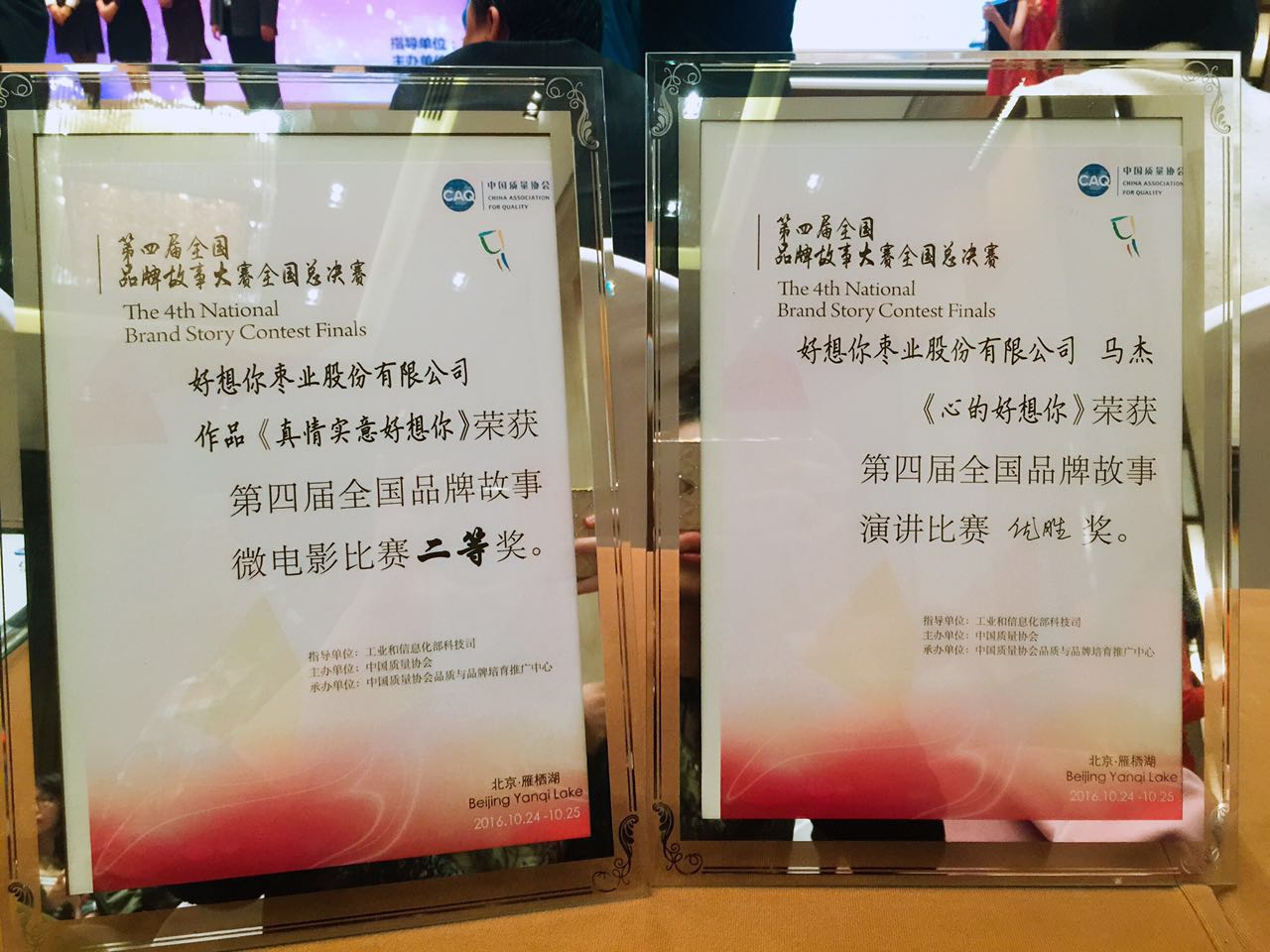 日前,中国质量协会传来捷报,在第四届全国品牌故事大赛中,好想你枣业选送的品牌故事影片《真情实意好想你》(公司形象宣传片)荣获微电影比赛单元二等奖;好想你营销管理中心马杰演讲的《心的好想你》获得演讲比赛单元优胜奖。