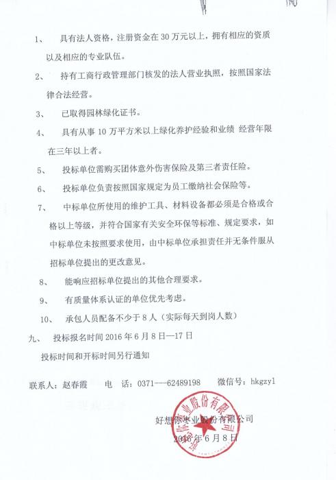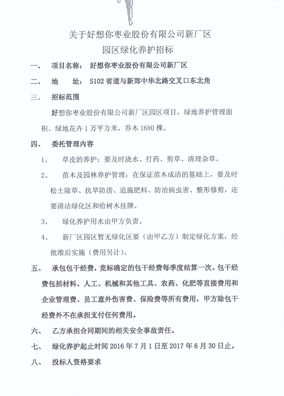 关于好想你枣业股份有限公司新厂区园区绿化养护招标
