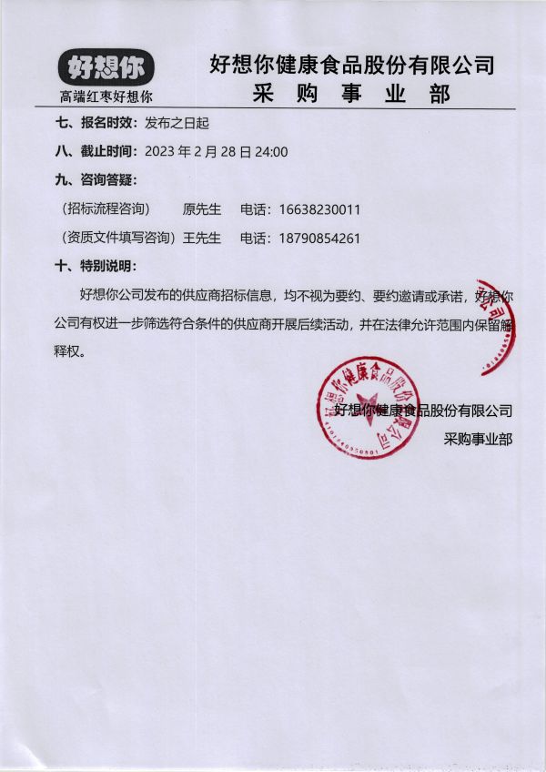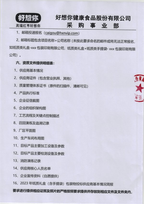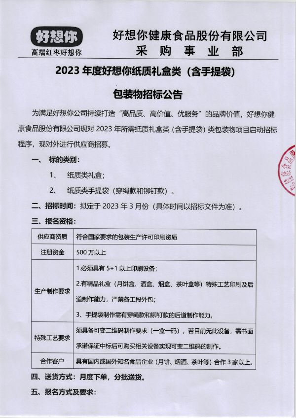 2023年度好想你纸质礼盒类(含手提袋) 包装物招标公告