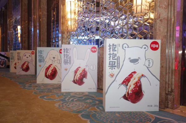 品牌营销层面,好想你一直以极富情感的形象深入消费者内心,百草味也秉承让消费者感受到幸福的沟通态度,二者融合后,将进一步通过产品加深与消费者的情感互动。发布会现场,百草味CMO王镜钥发布了双方开启协同战略之后的第一款战略性意义单品——“抱抱果”,