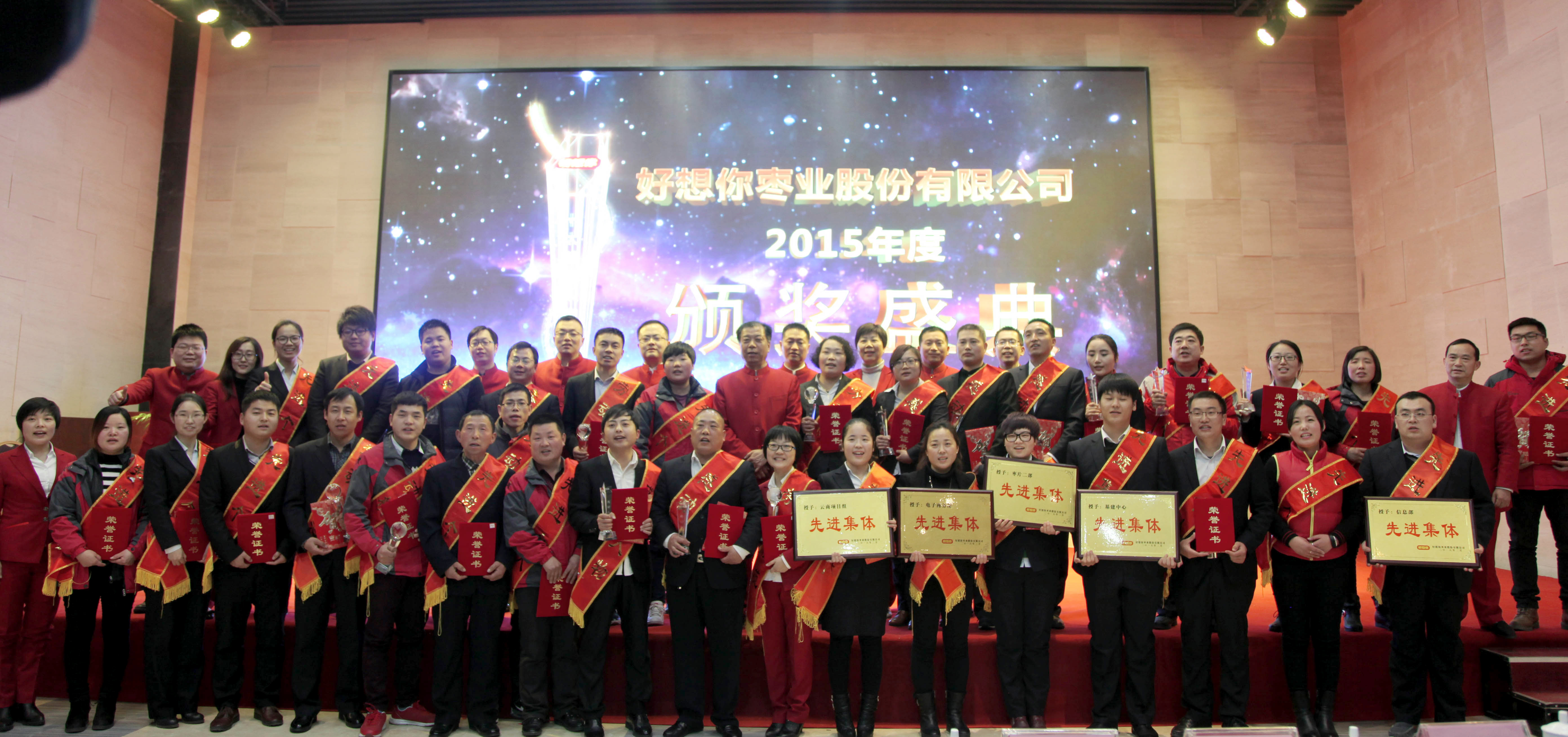 2月21日下午,好想你枣业2015年度颁奖盛典在同心饭店2号会议室隆重举行。以公司董事长石聚彬为首的高层领导和来自全国各地的公司经理级员工数百人齐聚一堂,共同见证荣耀时刻。