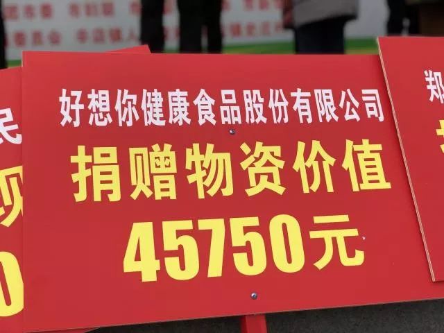 其中,好想你健康食品股份有限公司现场捐赠物资45750元,为农民朋友送去明星产品清菲菲红枣湘莲银耳汤和胡小辣。