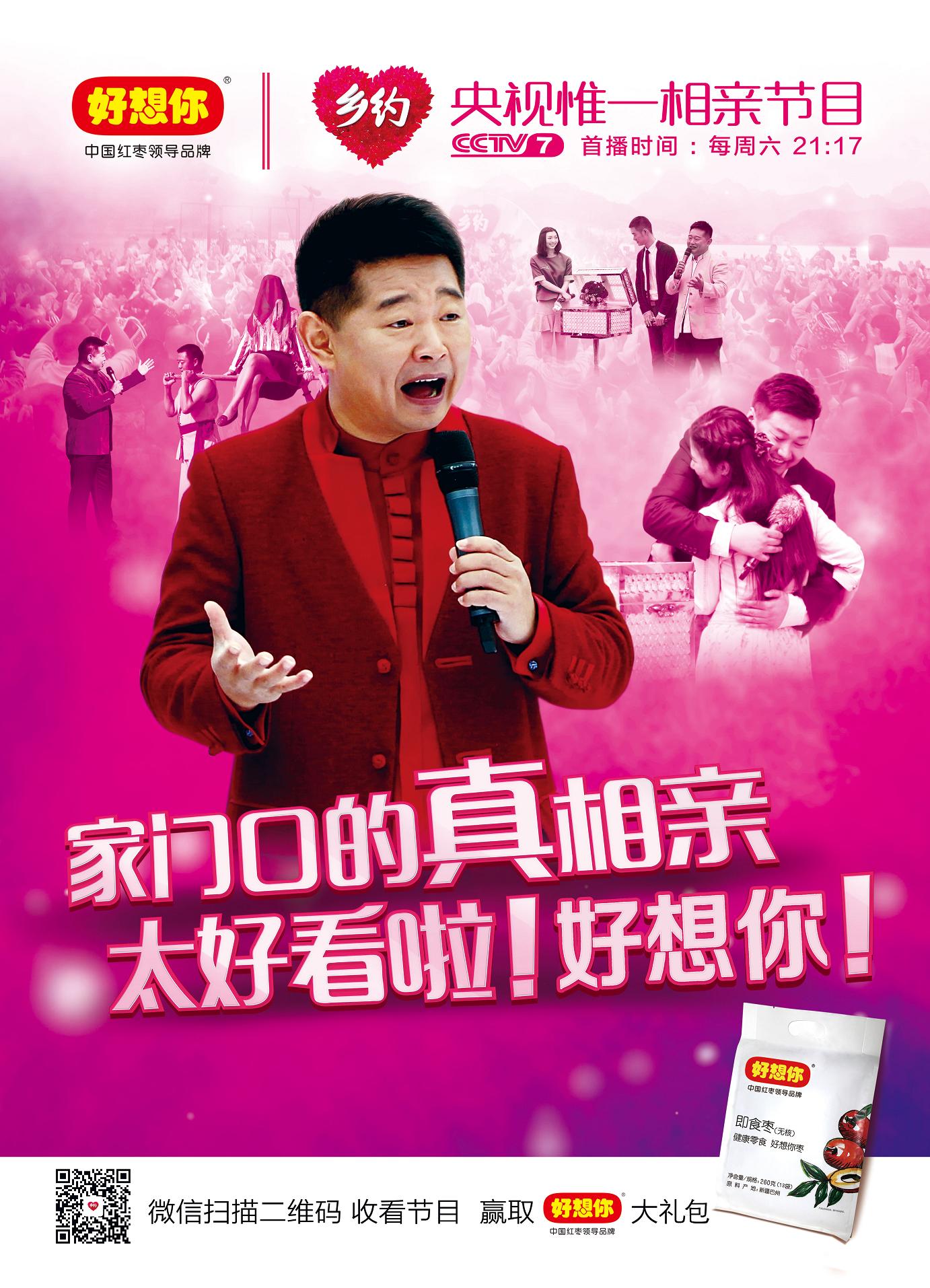 据了解,自2015年4月起,好想你与央视七套《乡约》栏目确立合作关系,合作形式包括现场产品赞助、海报灯箱冠名、微信互动等。五一期间,好想你联合央视七套《乡约》共同推出《快乐5?1?东坡鹊桥会》,取得了收视佳绩,其中《乡约米易》的收视率高达0.54%,在“酷云”收视数据的实时互动中,一度排名达到当天所有上星节目的第六名。