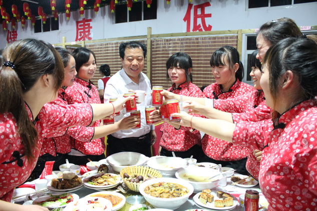 当晚的宴会上,示范园的厨师们为大家准备了丰盛的农家菜肴,一盘盘美味的月饼、清蒸花生和山药段、清炒红薯杆、炖鸡汤、红烧肉、红烧鱼等,散发着诱人的香气。觥筹交错间,各桌位还选出歌手,为大家登台献艺,《相信自己》、《幸福万年长》、《相亲相爱一家人》等一首首动听的歌曲,唱出了员工们的心声。