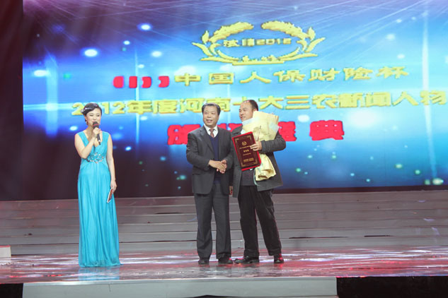 在当晚的颁奖典礼上,当选2012年度河南十大三农新闻人物的郏县冢头镇陈寨中心村党支部书记徐克俭、孟州市电力公司农电工马四、雏鹰农牧集团股份有限公司董事长侯建芳、南阳市果然风情实业有限公司董事长陈国华等一一登台领奖。