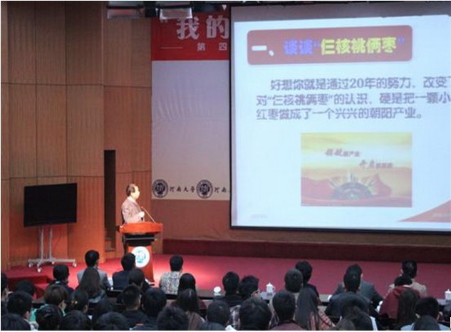 4月8日,好想你枣业董事长石聚彬前往河南大学发表题目为《中国梦 中原梦 我的梦》的大学生励志演讲,并以谦虚可亲的态度同河大学子分享了自己的创业格局和历程。在演讲中,石聚彬告诉同学们,有梦才有梦想;有了梦想,才有理想;有了理想才使我们充满激情、步伐坚定。