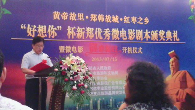 7月15日,由新郑市人民政府主办的黄帝故里?郑韩故城?红枣之乡“好想你”杯新郑优秀微电影剧本颁奖典礼暨新郑优秀微电影剧本征集活动自4月初征稿以来,收到了来自全国各地微电影爱好者发来的剧本稿件200余篇,经过专家们几轮紧张的认真评审,最终产生优秀剧本提名奖15个,优秀剧本创作奖5个,最佳剧本创作奖1个。由本次大赛组委会相关领导、嘉宾为获奖者颁发了奖金、荣誉证书和本次活动独家赞助者好想你枣业股份有限公司提供的礼品。结合选出来的最佳剧本和专家们的意见,最终决定将微电影的名称定为《“谜”恋新郑》。