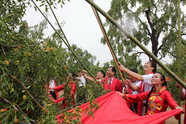 在好想你红枣科技示范园,随着打枣献枣仪式的举行,这个“红枣大观园”正式开门迎客。枣迷们尽情地摘红枣,拔花生,欣赏辣椒枣、茶壶枣、葫芦枣、磨盘枣等形态各异的枣儿,品尝独具特色的红枣宴席。示范园内的天下第一枣,让人惊叹不已,福枣山,寄托了人们对未来的希望,直径达两三米的五谷丰收大粮仓、漂亮的农家草棚等,吸引着游客的目光,大家纷纷驻足合影。
