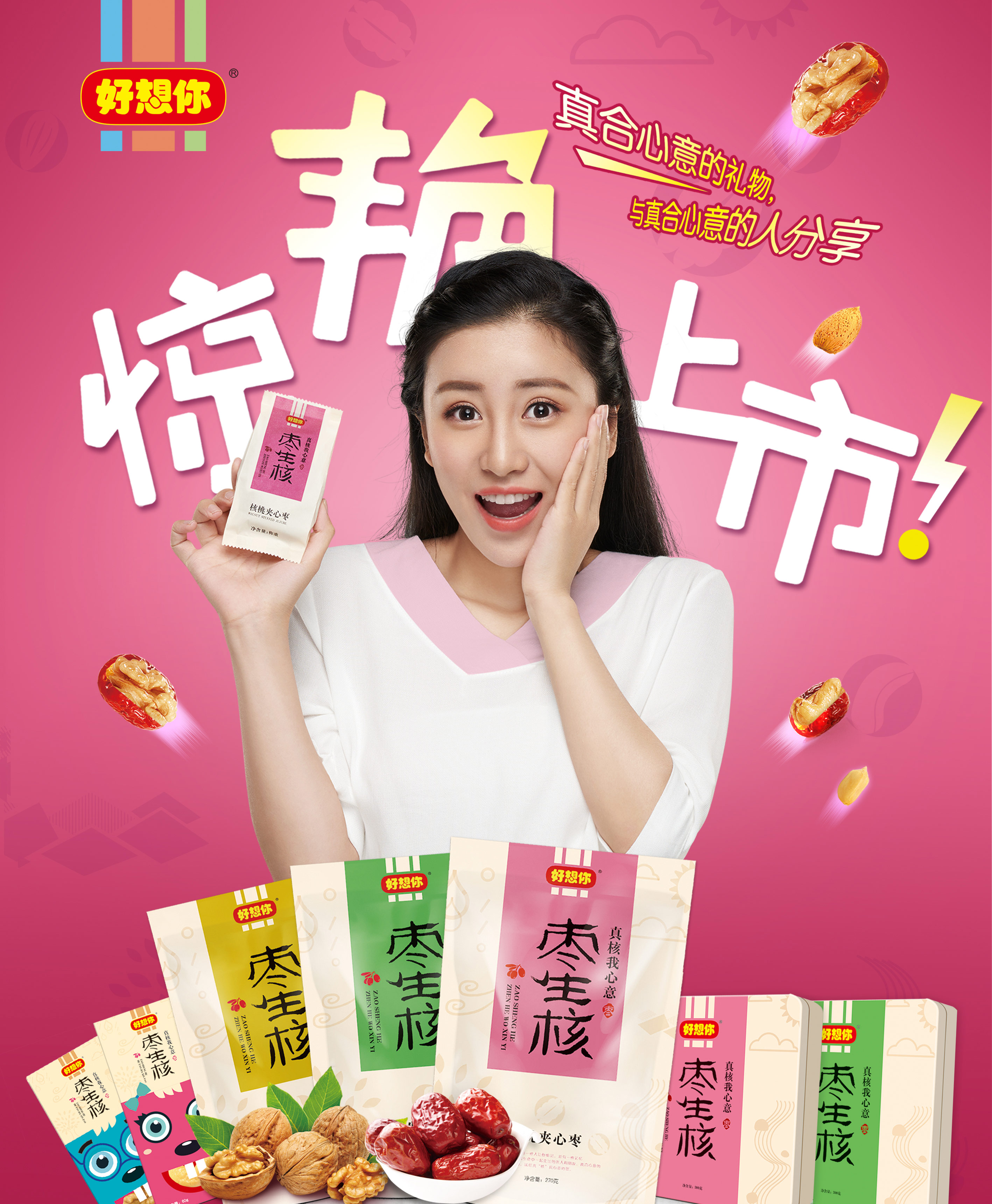 秘笈一:整合休闲零食市场,好想你健康再出发 已在红枣市场深耕20多年,拥有彪悍市场占有率的好想你枣业,本次推出枣生核系列产品,并将其作为2016年度主打产品,研发初衷非常简单。在产品研发之初,好想你研发团队对公司当前的产品香甜枣(红枣加花生)做了全面分析调研,有消费者指出,香甜枣香香甜甜的,口感略胜一筹,但放置时间长后,如果水分流失,会影响整体口感。于是,好想你大胆扩展设计思路,延伸到红枣加核桃、红枣加杏仁、红枣加腰果等的整体思路;同时也对红栆夹核桃食品的市场现状进行了调研。发现市场上网销的199个品牌、22005家店铺中,大多数均为中小店家,在产品品质、食品安全把关、营养成分等方面都还处于初级阶段,大多以成本更为低廉的骏枣+核桃为主,产品质量参差不齐,而且远未形成规模,难以发挥规模效应、品牌效应。好想你枣业将香甜枣升级为枣生核系列产品,同时作为年度主打产品,意在整合升级当前杂乱的栆夹核桃产品,为休闲零食市场提供一款真正高品质、好营养,健康又美味的王牌产品。